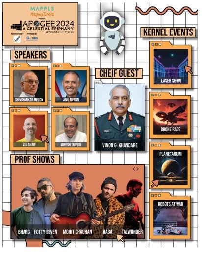 While the speakers and guests set the tone for the fest, APOGEE offers a diverse range of events to engage and entertain participants. From Prof shows featuring Bollywood sensation Mohit Chauhan to internet sensations like Talwiinder and Bharg, the stage will be alive with music and talent. Also be ready to be entertained by the comedic brilliance of the duo of Samay Raina and Akash Mehta as they take the stage on the final day.