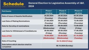 गौरतलब है कि जम्मू-कश्मीर में 2018 में सरकार भंग होने के बाद से ही चुनाव नहीं हुए हैं। जम्मू-कश्मीर में आखिरी बार 2014 में चुनाव हुए थे। तब भाजपा-पीडीपी ने गठबंधन बनाया था। हालांकि, बाद में भाजपा ने इस गठबंधन से दूरी बना ली। 2018 में भाजपा और पीपुल्स डेमोक्रेटिक पार्टी (पीडीपी) की गठबंधन वाली सरकार गिर गई थी। जम्मू-कश्मीर में मतदाता सूची 20 अगस्त को जारी होगी। जम्मू कश्मीर में तीन चरणों चुनाव होगा। 18 सितंबर को पहले चरण का मतदान, 25 सितंबर को दूसरे चरण का मतदान और एक अक्तूबर को तीसरे चरण का मतदान होगा। नतीजे चार अक्तूबर को जारी होंगे।