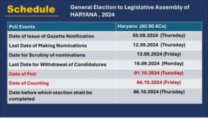 हरियाणा में मौजूदा सरकार का कार्यकाल नवंबर में खत्म हो रहा है। यहां आखिरी बार 2019 में चुनाव हुए थे। तब भाजपा-जजपा ने साथ आकर सरकार बनाई थी। हालांकि, इसी साल मार्च में दोनों पार्टियों का गठबंधन टूट गया था। दूसरी तरफ भाजपा ने मनोहर लाल खट्टर को हटाकर नायब सिंह सैनी को हरियाणा का मुख्यमंत्री नियुक्त किया था। हरियाण में 27 अगस्त को अंतिम मतदाता सूची प्रकाशित हो जाएगी। राज्य में एक चरण में एक अक्तूबर को मतदान होगा और चार अक्तूबर को नतीजे जारी होंगे।