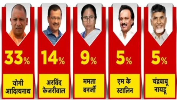 ‘मूड ऑफ द नेशन’ सर्वे में देश के 30 राज्यों की जनता से सबसे लोकप्रिय मुख्यमंत्री के बारे में पूछे गये सवालों में योगी आदित्यनाथ को सर्वाधिक मत मिले हैं। जनता से पूछा गया कि वो किसे देश का सबसे बेहतरीन मुख्यमंत्री मानते हैं, इसपर 33 प्रतिशत से अधिक लोगों ने योगी आदित्यनाथ के नाम पर अपनी मुहर लगाई है। इस सर्वे में दिल्ली के मुख्यमंत्री अरविंद केजरीवाल को मात्र 13.8 प्रतिशत लोगों ने लोकप्रिय माना है, जबकि पश्चिम बंगाल की सीएम लिस्ट में तीसरे स्थान पर हैं। उन्हें 9.1 प्रतिशत लोगों ने समर्थन दिया। वहीं चौथे नंबर पर तमिलनाडु के मुख्यमंत्री एम के स्टालिन हैं, जिन्हें 4.7 प्रतिशत मत मिला। इसी तरह पांचवें नंबर पर आंध्र प्रदेश के सीएम चंद्रबाबू नायडू हैं, जिन्हें 4.6 फीसदी लोगों ने समर्थन दिया।
