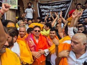 प्रशासन जहां मीटिंग कर रहा था वहीं दूसरी तरफ बांके बिहारी मंदिर पर तीर्थ पुरोहित प्रदर्शन कर रहे थे। अखिल भारतीय तीर्थ पुरोहित महासभा के राष्ट्रीय संरक्षक महेश पाठक के नेतृत्व में तीर्थ पुरोहितों ने किशोरपुरा से बांके बिहारी मंदिर तक पैदल मार्च किया और कॉरिडोर के विरोध में जमकर नारेबाजी की। हाथों में पोस्टर लिए तीर्थ पुरोहित बांके बिहारी मंदिर के मुख्य द्वार पर पहुंचे।