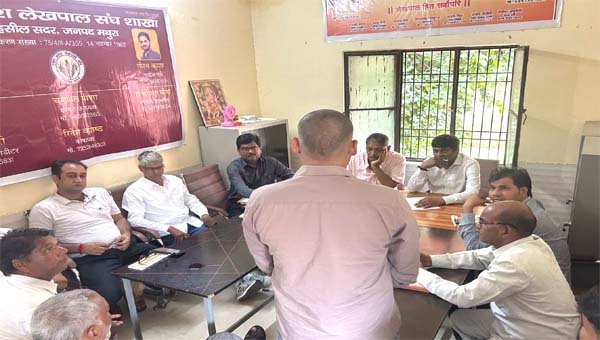 ज्ञात रहे कि बीती 7 अगस्त को तहसीत-सदर के ग्राम-राल के नगला खुशीपुरा में गुड़ खान्डसारी समिति की जमीन से अवैध कब्जा हटाने पहुंची राजस्व टीम की कार्यवाही के दौरान अवैध कब्जेदारों द्वारा खुद को आग लगा ली गयी थी जिसमें कार्यवाही करते हुए जिला प्रशासन द्वारा लेखपात कपिल उपाध्याय व राजस्व निरीक्षक राजेंद्र राणा को निलम्बित कर दिया गया। इस मामले में देर रात थाना जैंत में मुकदमा भी दर्ज कर दिया गया । इस प्रकरण में सोमवार को उत्तर प्रदेश लेखपाल संघ की आपात कालीन कार्यकारिणी की बैठक तहसील सदर स्थित संगठन कार्यालय में हुई जिसमें सर्वसम्मति से निर्णय हुआ कि अब समस्त लेखपात अपनी-अपनी तहसीलों के व्हाट्स एप ग्रुपों का परित्याग कर देगे एवं कल 12 अगस्त को प्रात: 10 बजे तहसील सदर स्थित सभागार में आम सभा की बैठक में शामिल होंगे। संचालन लेखपाल नितिन चतुर्वेदी ने किया।
