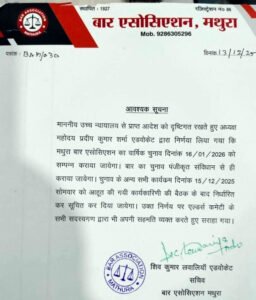 मथुरा। भारी जद्दोजहद अंतर विरोध के पश्चात मथुरा बार एसोसिएशन के चुनाव की तिथि घोषित कर दी गई है। अध्यक्ष प्रदीप शर्मा के अनुसार वार्षिक चुनाव 16 जनवरी 2026 को कराया जाएगा।