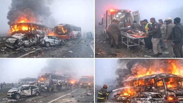 मथुरा। घने कोहरे के चलते बीती रात्रि तड़के यमुना एक्सप्रेस वे पर एक दर्जन से अधिक वाहन आपस में भिड़ गए। दुर्घटना के भीषण होने का अंदाज इसी बात से लगाए सकता है कि सभी वाहनों में आग लग गई। सरकारी सूत्रों के मुताबिक दुर्घटना में 13 व्यक्तियों की मृत्यु हुई है और चार लोगों की लाश इतनी जल गई कि उनकी पहचान मुश्किल है। उनकी डीएनए सैंपलिंग की कार्रवाई की जा रही है। चार शवों की पहचान हो गई है । हादसे की सूचना मिलते ही पुलिस, दमकल विभाग और यमुना एक्सप्रेस वे प्राधिकरण की टीमें मौके पर पहुंचीं। काफी मशक्कत के बाद आग पर काबू पाया गया और घायलों को वाहनों से बाहर निकाला गया। घायलों को जिला अस्पताल मथुरा, 100 शैय्या अस्पताल वृंदावन में भर्ती कराया गया है, जबकि गंभीर रूप से घायलों को एसएन मेडिकल कॉलेज आगरा रेफर किया गया है। 38 लोग जिला अस्पताल में भर्ती हैं जिनका उपचार चल रहा है। 39 बलदेव सीएचसी पर हैं। तीन मृतकों की पहचान हुई है, जिसमें अखिलेंद्र प्रताप यादव पुत्र वंशीधर, निवासी मुद्दीनपुर, थाना सराय ममरेज, जिला प्रयागराज। रामपाल पुत्र पहोड़ीराम, निवासी आजमगढ़। सुल्तान निवासी गोंडा की पहचान हुई है। मृतक अखिलेंद्र वित्त मंत्री सुरेश खन्ना के प्राइवेट रूप में सचिव के रूप में काम देखते थे। डीएम सीपी सिंह ने बताया कि इस हादसे की जांच एडीएम प्रशासन को सौंपी गई है।
