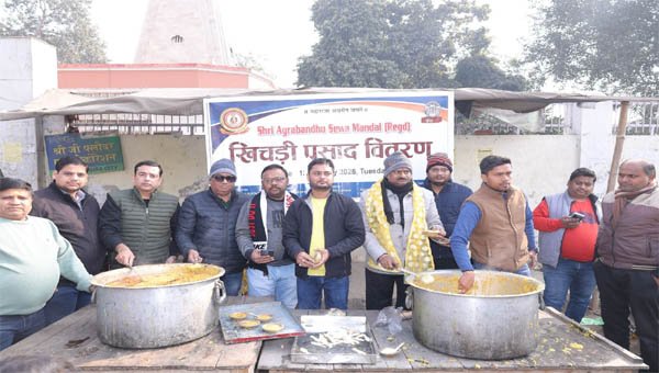 मथुरा। श्री अग्रबंधु सेवा मंडल द्वारा मकर संक्रांति के पावन अवसर पर हर वर्ष की भांति इस वर्ष भी लक्ष्मीनारायण मंदिर पर भव्य खिचड़ी प्रसाद वितरण कार्यक्रम आयोजित किया गया। इस अवसर पर मंडल के सदस्यों द्वारा लगभग 501 किलो खिचड़ी प्रसाद श्रद्धालुओं को वितरित किया गया, जिसमें बड़ी संख्या में भक्तों ने प्रसाद ग्रहण किया।