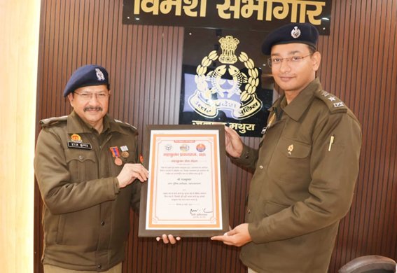 मथुरा । महाकुंभ प्रयागराज–2025 के दौरान सुरक्षा व्यवस्था के क्षेत्र में उत्कृष्ट, सराहनीय एवं अनुकरणीय योगदान प्रदान करने के लिए जनपद मथुरा में नियुक्त राजकुमार, पुलिस अधीक्षक (सुरक्षा) को मुख्यमंत्री, उत्तर प्रदेश सरकार द्वारा “महाकुंभ सेवा मेडल” से सम्मानित किया गया है। उक्त पदक से अपर पुलिस अधीक्षक राजकुमार को वरिष्ठ पुलिस अधीक्षक श्लोक कुमार द्वारा प्रदान किया गया। यह सम्मान महाकुंभ जैसे विशाल और चुनौतीपूर्ण आयोजन में उनके कुशल नेतृत्व, कर्तव्यनिष्ठा एवं समर्पित सेवाओं का प्रतीक है। पुलिस प्रशासन से जुड़े अधिकारियों एवं कर्मचारियों ने इस उपलब्धि पर उन्हें शुभकामनाएं दीं और इसे जनपद के लिए गौरव का विषय बताया।