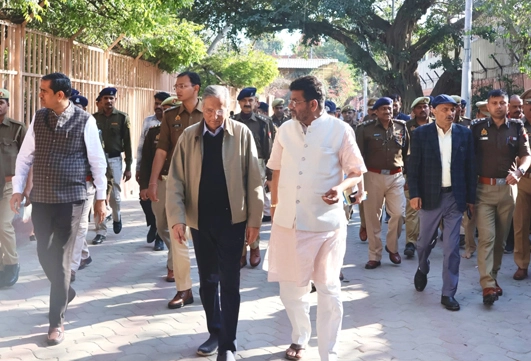 मथुरा। आगामी पर्वों एवं विशेष अवसरों के दृष्टिगत शनिवार को प्रशासन और पुलिस के वरिष्ठ अधिकारियों ने श्रीकृष्ण जन्मभूमि मंदिर परिसर का विस्तृत निरीक्षण किया। उत्तर प्रदेश ब्रज तीर्थ विकास परिषद के उपाध्यक्ष शैलजा कांत मिश्र, मंडलायुक्त नगेन्द्र प्रताप, पुलिस उपमहानिरीक्षक शैलेश कुमार पाण्डेय, जिलाधिकारी चंद्र प्रकाश सिंह एवं वरिष्ठ पुलिस अधीक्षक श्लोक कुमार ने संयुक्त रूप से मंदिर क्षेत्र का भ्रमण कर सुरक्षा व्यवस्थाओं का जायजा लिया।