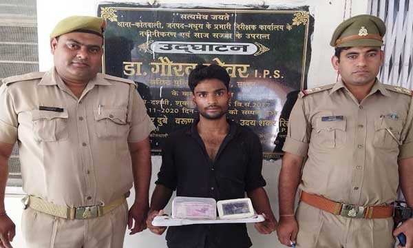 मथुरा। एक पखबाडा पूर्व शहर के विश्राम घाट स्थित बर्तन की दुकान-गौदाम से लाखों रू. की नकदी, जेवर चुराने वाले शातिर चोर को पुलिस ने गिरफ्तार कर जेल भेज दिया है। 14 जून को रात्रि विश्राम घाट स्थित गताश्रम टीला पर हरि कसेरे बर्तन वालों के तांबे के बर्तन, पूजा में इस्तेमाल होने वाले सामान का गौदाम से अज्ञात चोर नकब जनी कर नकदी जेवर, बर्तन आदि चुरा ले गये। चोरी की इस घटना से व्यापारियों में आक्रोश फैल गया। चोर घटना के बाद व्यापारी को पुलिस में शिकायत न करने की धमकी का पत्र भी मौके पर छोड गये थे। 16 जून को इस मामले में पुलिस ने मुकदमा दर्ज कर छानबीन शुरू कर दी है। पता चला कि चोर द्वारिकाधीश मंदिर के पास मानिक चौक क्षेत्र का रहने वाला सागर कश्यप पुत्र अशोक कश्यप है जिसे आज मुखबिर की सूचना पर गिरफ्तार कर लिया। इसकी निशानदेही पर 98 हजार 800 रू एक सोने की चूडी, एक अंगूठी बरामद हुई है।