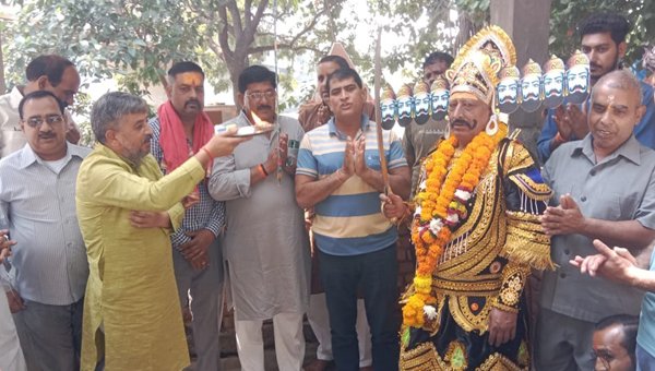मथुरा। महानगर के यमुनापार स्थित शिव मंदिर पर भगवान शिव के परम भक्त शिव तांडव स्त्रोत के रचियता प्रकांड विद्वान महापंडित दशानन की महा आरती की गई। रावण के स्वरूप द्वारा भगवान भोलेनाथ की उपासना की गई। शिव भक्तो के द्वारा रावण के पुतला दहन का विरोध किया गया। मंदिर में जय लंकेश के जय शिव के नारे लगाए गए।