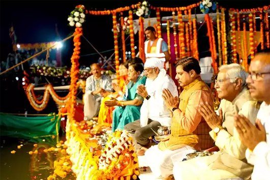 मुख्यमंत्री डॉ. यादव ने नर्मदा तट पर बनाये गये आकर्षक जल मंच पर वैदिक मंत्रोच्चार के मध्य माँ नर्मदा की विधिवत पूजा-अर्चना की। उन्होंने माँ नर्मदा का जल अभिषेक कर माँ नर्मदा की महाआरती की। नर्मदा प्रकटोत्सव एवं नर्मदापुरम के गौरव दिवस के अवसर पर मंगलवार को लोकप्रिय कलाकारों द्वारा सांस्कृतिक कार्यक्रमों की प्रस्तुति दी गई। जिसके अंतर्गत सेठानी घाट पर मीशा शर्मा एवं उनके साथी गणों द्वारा निमाड़ी लोक गायन की सुमधुर प्रस्तुति दी गई। देर रात्री उज्जेन की कशिश शीतलानी एवं उनके सा थीगणों द्वारा कथा नर्मदा की नृत्य नाटिका के माध्यम से प्रस्तुती दी गई। जिसका दर्शको नें खूब आनंद उठाया। इसके पश्चात भोपाल से आये विकास सिरमोलिया एवं उनके साथियों की भक्ति गायन की भाव-विभोर करने वाली प्रस्तुती हुई।