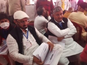 मांट विधानसभा मतगणना पंडाल में उदासी की चादर उड़े हुए गठबंधन प्रत्याशी संजय लाठर और रालोद नेता योगेश नोहवार।