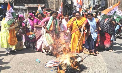 मथुरा। उत्तर प्रदेश महिला आयोग की उपाध्यक्ष व भाजपा नेता अपर्णा यादव द्वारा भारतीय राष्ट्रीय कांग्रेस का झंडा जलाए जाने के विरोध में कांग्रेस की महिला पदाधिकारियों ने मंगलवार को होली गेट पर जोरदार प्रदर्शन करते हुए उनका पुतला दहन किया। कार्यक्रम का नेतृत्व जिला कांग्रेस उपाध्यक्ष श्रीमती रुपा लवानिया ने किया। उक्त कार्यक्रम जिला कांग्रेस अध्यक्ष मुकेश धनगर के निर्देश पर किया गया।