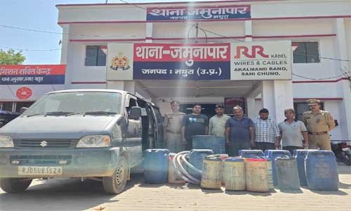 मथुरा। जनपद में अवैध ईंधन कारोबार के खिलाफ बड़ी कार्रवाई करते हुए थाना जमुनापार पुलिस, रिवार्डिड टीम, आबकारी विभाग और जिला पूर्ति विभाग की संयुक्त टीम ने एक संगठित गिरोह का भंडाफोड़ किया है। टीम ने लक्ष्मीनगर-गोकुल रोड स्थित ब्रजवासी ढाबा पर छापा मारकर 5 अभियुक्तों को गिरफ्तार किया जो टैंकरों से एथेनॉल निकालकर पेट्रोल में अपमिश्रण कर बाजार में बेच रहे थे।