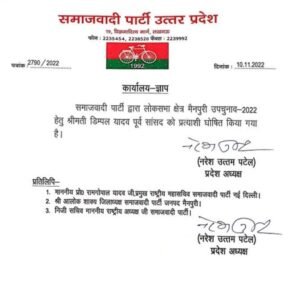 लखनऊ । समाजवादी पार्टी ने नेताजी मुलायम सिंह यादव के निधन के बाद खाली मैनपुरी सीट से पूर्व सांसद डिंपल यादव को अपना प्रत्याशी बनाया है। मैनपुरी में लोकसभा का उप चुनाव पांच दिसंबर को होना है। मुलायम सिंह यादव के निधन से रिक्त मैनपुरी लोकसभा सीट के उपचुनाव में सपा प्रमुख अखिलेश यादव की पत्नी पूर्व सांसद डिंपल यादव पार्टी प्रत्याशी होंगी। समाजवादी पार्टी के राष्ट्रीय अध्यक्ष अखिलेश यादव की पत्नी पूर्व सांसद डिंपल यादव को पार्टी ने मैनपुरी लोकसभा उप चुनाव में प्रत्याशी बनाया है। डिंपल यादव 2019 में कन्नौज लोकसभा चुनाव में हार गई थीं, जबकि वह कन्नौज से सांसद थीं।