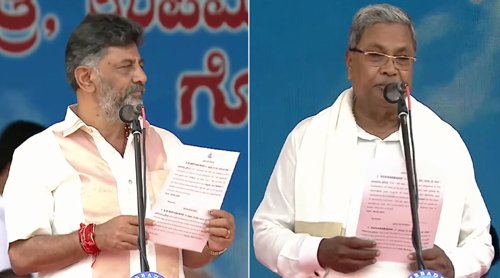 बेंगलुरु । सिद्दारमैया और डी.के. शिवकुमार ने शनिवार को राज्य में नई कांग्रेस सरकार के शपथ ग्रहण समारोह में क्रमश: कर्नाटक के नए मुख्यमंत्री और उपमुख्यमंत्री के रूप में शपथ ली।राज्य के राज्यपाल थावरचंद गहलोत ने यहां कांटीरावा स्टेडियम में चल रहे समारोह में दोनों नेताओं को पद की शपथ दिलाई। मुख्यमंत्री के रूप में सिद्दारमैया का यह दूसरा कार्यकाल है। उन्होंने इस पद पर 2013 और 2018 के बीच सेवा की थी। सिद्दारमैया ने जहां भगवान के नाम पर 24वें मुख्यमंत्री के रूप में शपथ ली, वहीं शिवकुमार ने अपने आध्यात्मिक गुरु श्री गंगाधर अज्जा के नाम पर शपथ ली।