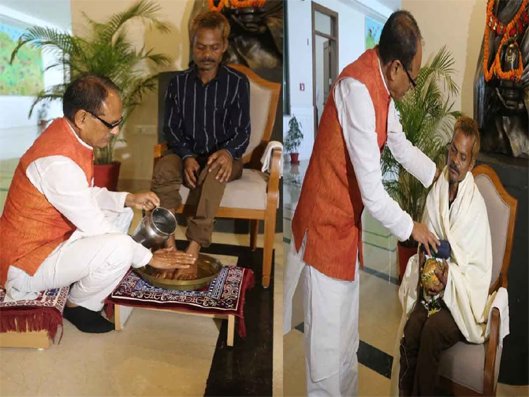 भोपाल । मध्य प्रदेश के सीधी जिले में आदिवासी दशमत रावत पर एक भाजपा कार्यकर्ता के बेशर्मी से पेशाब करने की घटना के बाद से सियासत गरमाई हुई है। गुरुवार को पीड़ित दशमत रावत भोपाल मुख्यमंत्री निवास पहुंचे। यहां सीएम शिवराज ने दशमत के पैर धोकर और शॉल ओढ़ाकर सम्मान किया। सीएम शिवराज ने कहा कि मन दुखी है। मेरे लिए जनता ही भगवान है।