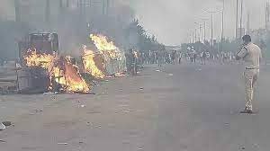 उपद्रवियों ने रोड पर तीन किलोमीटर में जो भी वाहन दिखा, उसमें ही आग लगा दी। इसके बाद 500 से अधिक लोगों ने बस से टक्कर मार साइबर थाने की दीवार तोड़ी और अंदर घुस गए। डायल 112 की गाड़ियां जला दीं। अंदर तोड़फोड़ की। आग लगाने का प्रयास किया। कुछ दुकानों में लूटपाट के बाद आग लगा दी। हीरो बाइक के शोरूम से 200 बाइक लूटीं। शोरूम में तोड़फोड़ की। कर्मचारियों को पीटा।