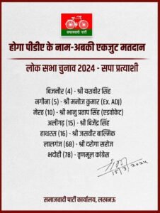 लखनऊ। आगामी लोकसभा चुनाव के मद्देनजर समाजवादी पार्टी ने शुक्रवार को अपने उम्मीदवारों की तीसरी सूची जारी कर दी है। पार्टा ने छह उम्मीदवारों का एलान किया है। सूची में सपा ने भदोही लोकसभा सीट ममता बनर्जी की पार्टी तृणमूल कांग्रेस के लिए छोड़ी है।