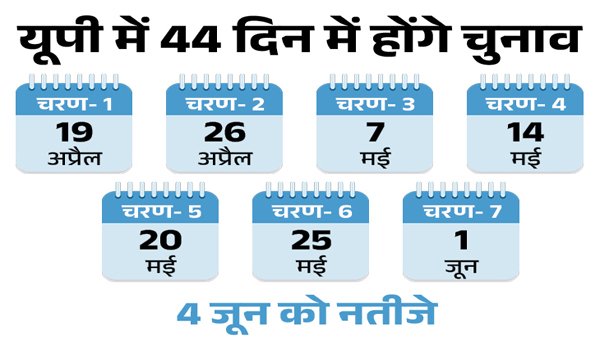 नई दिल्ली। यूपी में पहले चरण में सहारनपुर केरना मुजफ्फरनगर बिजनौर नगीना मुरादाबाद रामपुर पीलीभीत तथा दूसरे चरण में अमरोहा मेरठ बागपत गाजियाबाद गौतम बुध नगर बुलंदशहर अलीगढ़ मथुरा तीसरे चरण में संभल हाथरस आगरा फतेहपुर सीकरी फिरोजाबाद मैनपुरी एटा बदायूं आंवला बरेली चौथे चरण में शाहजहांपुर लखीमपुर खीरी धोरेहरा सीतापुर हरदोई मिश्रिख उन्नाव फर्रुखाबाद इटावा कन्नौज कानपुर अकबरपुर बहराइच पांचवे चरण में मोहनलालगंज लखनऊ रायबरेली अमेठी जालौन झांसी हमीरपुर बांदा फतेहपुर कौशांबी बाराबंकी फैजाबाद कैसरगंज गोंडा छठवे चरण में सुल्तानपुर प्रतापगढ़ फूलपुर इलाहाबाद अंबेडकर नगर श्रावस्ती डुमरियागंज बस्ती संत कबीर नगर लालगंज आजमगढ़ जौनपुर मछली शहर भदोही जबकि अंतिम सातवें चरण में महाराजगंज गोरखपुर कुशीनगर देवरिया बांसगांव घोसी सलेमपुर बलिया गाजीपुर चंदौली वाराणसी मिर्जापुर रावटसगंज में चुनाव होंगे।