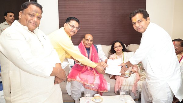मथुरा। अपने दो दिवसीय कार्यक्रम पर मथुरा आए देश के रक्षा मंत्री राजनाथ सिंह ने भाजपा पदाधिकारियों और जनप्रतिनिधियों के साथ विस्तृत चर्चा की और मथुरा में चल रहे विकास कार्यों की जानकारी ली। शुक्रवार को बाँके बिहारी के दर्शन के उपरांत वह मथुरा की जीएलए यूनिवर्सिटी के कुलाधिपति नारायण दास अग्रवाल के वृंदावन स्थित निवास पर पहुंचे जहाँ भाजपा पदाधिकारियों एवं जनप्रतिनिधियों द्वारा उनका भव्य स्वागत किया गया। विधायक श्रीकांत शर्मा एवं महानगर अध्यक्ष घनश्याम लोधी के द्वारा रक्षा मंत्री को छावनी क्षेत्र में स्थित रिहायिशी क्षेत्र को नगर निगम में शामिल करने के लिए रक्षा मंत्री को आग्रह पत्र सौंपा गया।
